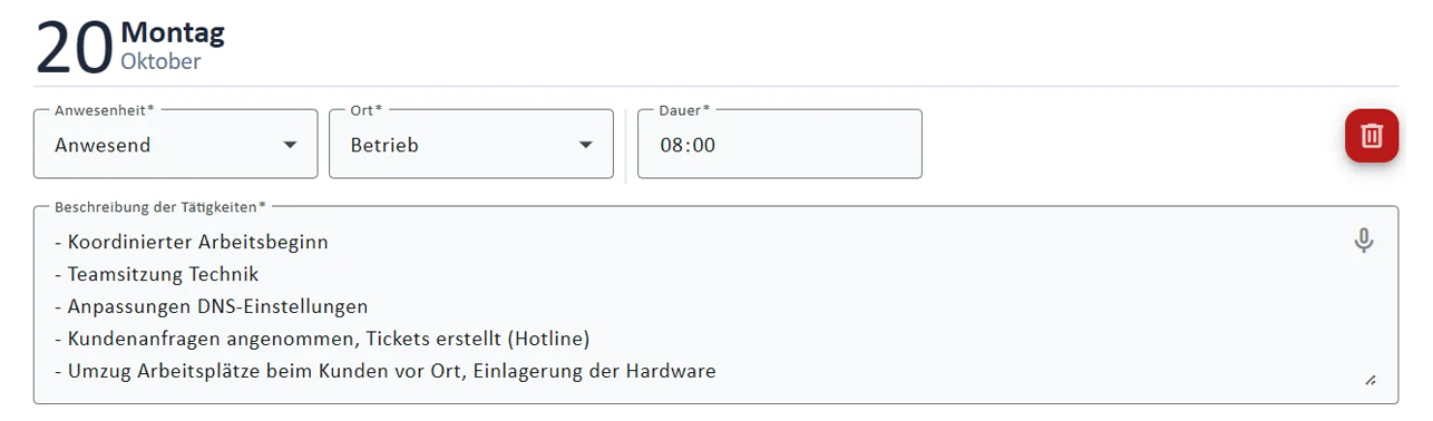 Mit KI-Unterstützung wird doppelte Erfassung vermieden: Aus den erfassten Serviceaktivitäten generiert das System per Knopfdruck automatisch Textvorschläge, die der Auszubildende nur noch anpassen muss.